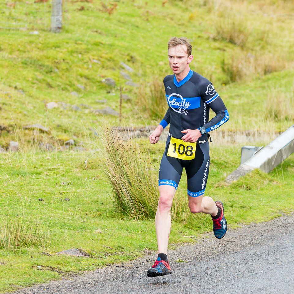 The weather was also tough. It was a dreich autumnal day. The temperature never got above 10-11 degrees, there were prolonged showers and a moderate wind – certainly a hard shift for the Marshals out on the run course. The north-west wind helped on the cycle but given the overall conditions, it was a surprise to see two records broken. Congratulations to Cameron Young, of The Mac Milers, whose time of 1:40:51 shaved ten seconds off Ewan Taylor’s Open record, and to Duncan Ball, of Penicuik Harriers, whose time of 2:09:10 improved Ray Wilby’s Vintage (over 60) record by nearly four minutes.